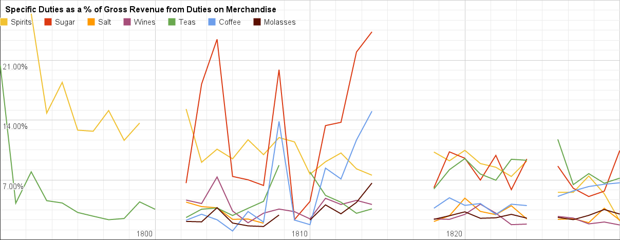 In the early republic, spirits consistently provided significant duty-money, often followed by wine. Sugar was often an even bigger contributor (though of course they used it for things other than Coke products, unlike now) – though and tea and coffee were no slouches, either. The republic was kept afloat by some potent brews.